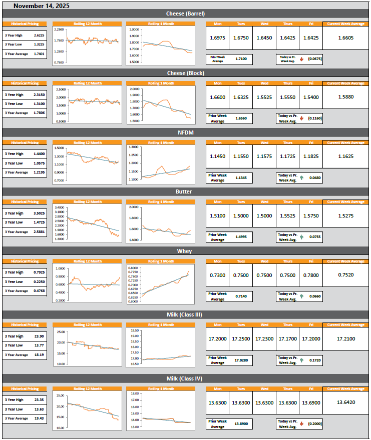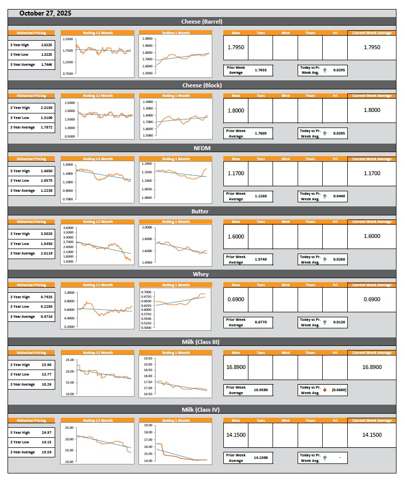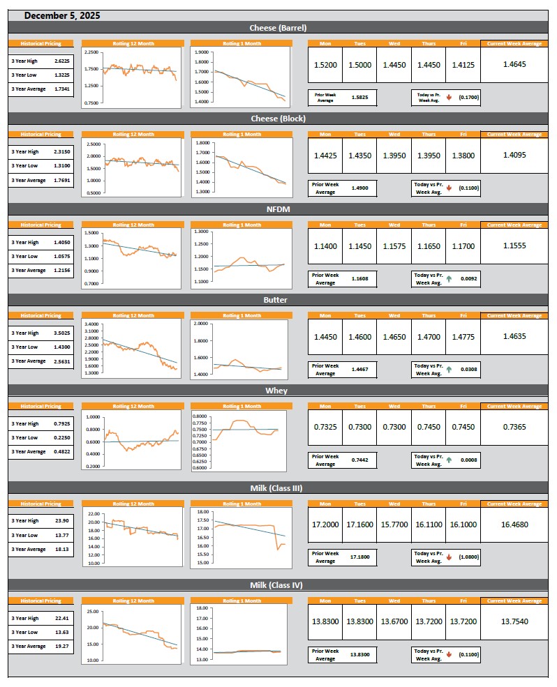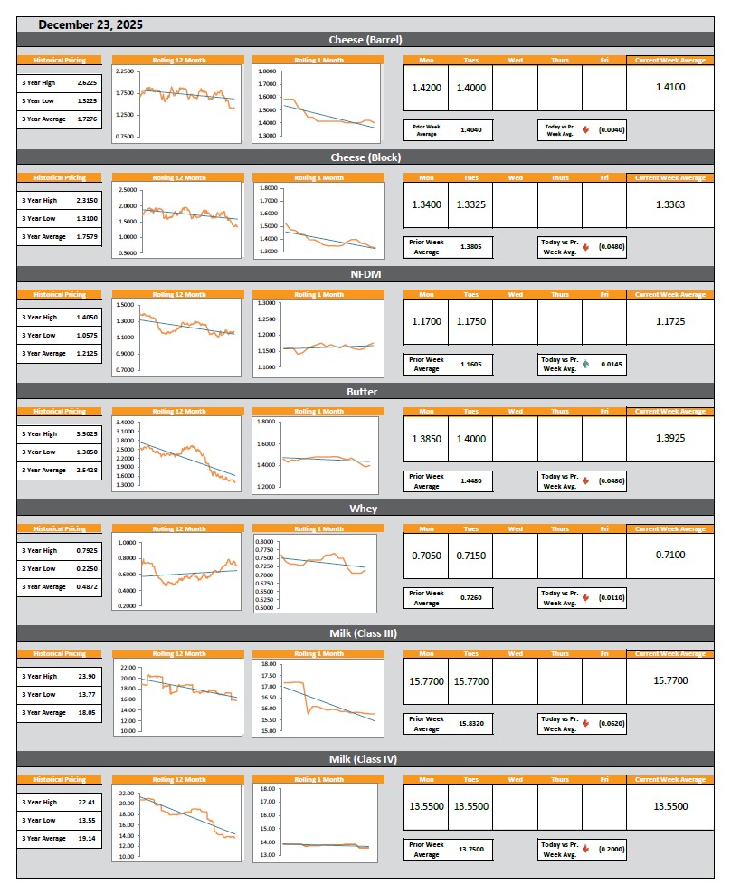 The Dairy Dashboard is an in-depth price analysis for cheese barrels and blocks, non-fat dry milk (NFDM), butter, Class III and IV milk, and whey. Aside from daily prices, the Dairy Dashboard outlines historical highs and lows, rolling 1-month and 12-month price trends, and key pricing averages for each of the commodities.