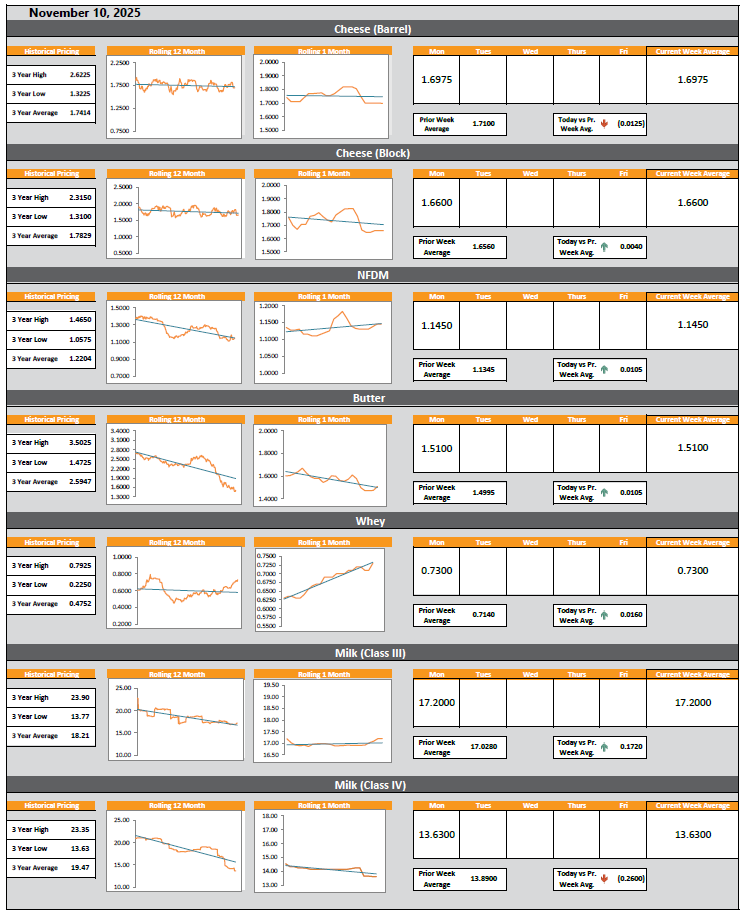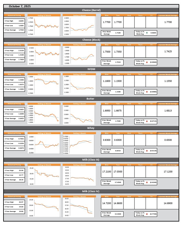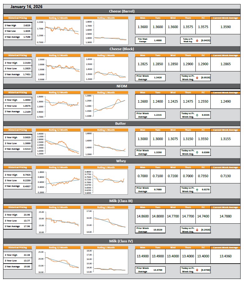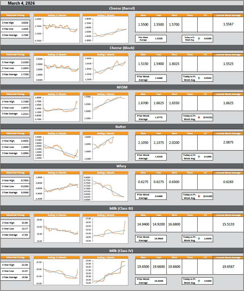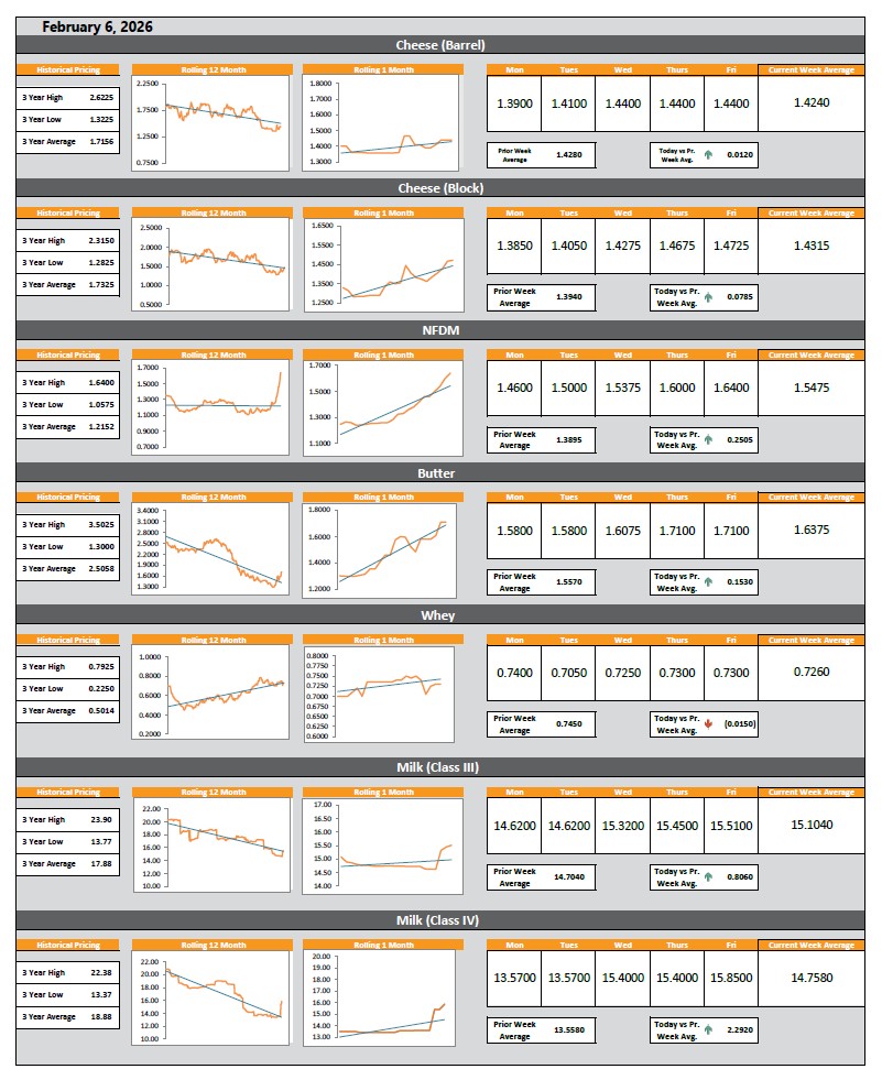 The Dairy Dashboard is an in-depth price analysis for cheese barrels and blocks, non-fat dry milk (NFDM), butter, Class III and IV milk, and whey. Aside from daily prices, the Dairy Dashboard outlines historical highs and lows, rolling 1-month and 12-month price trends, and key pricing averages for each of the commodities.